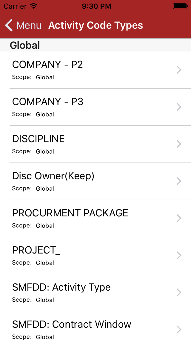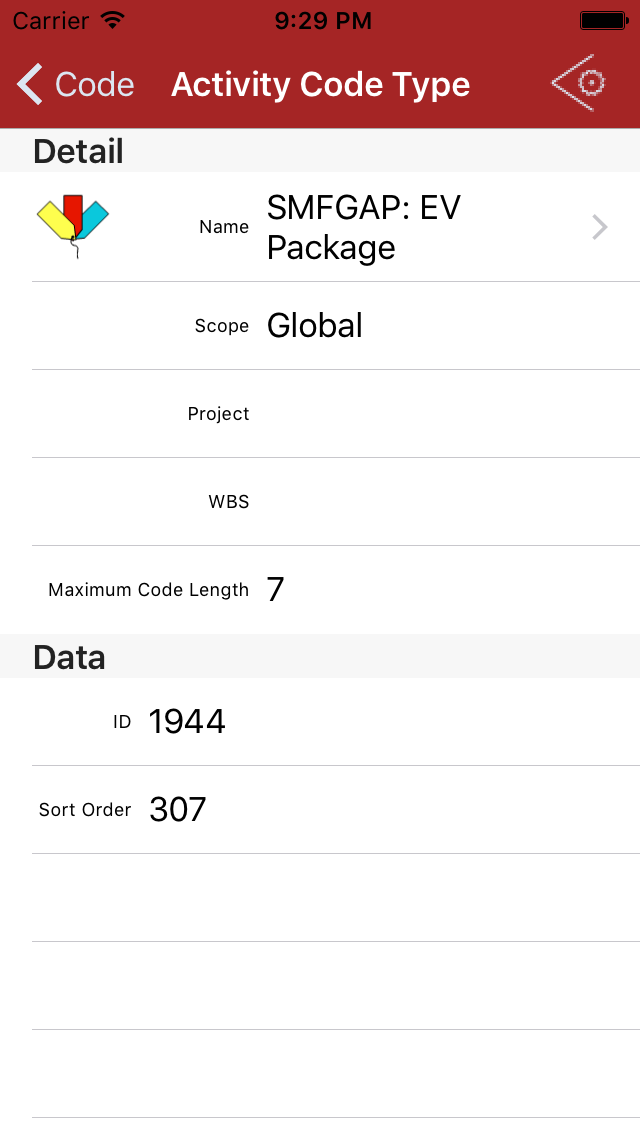 Tap an Activity Code Type item to present the detail view