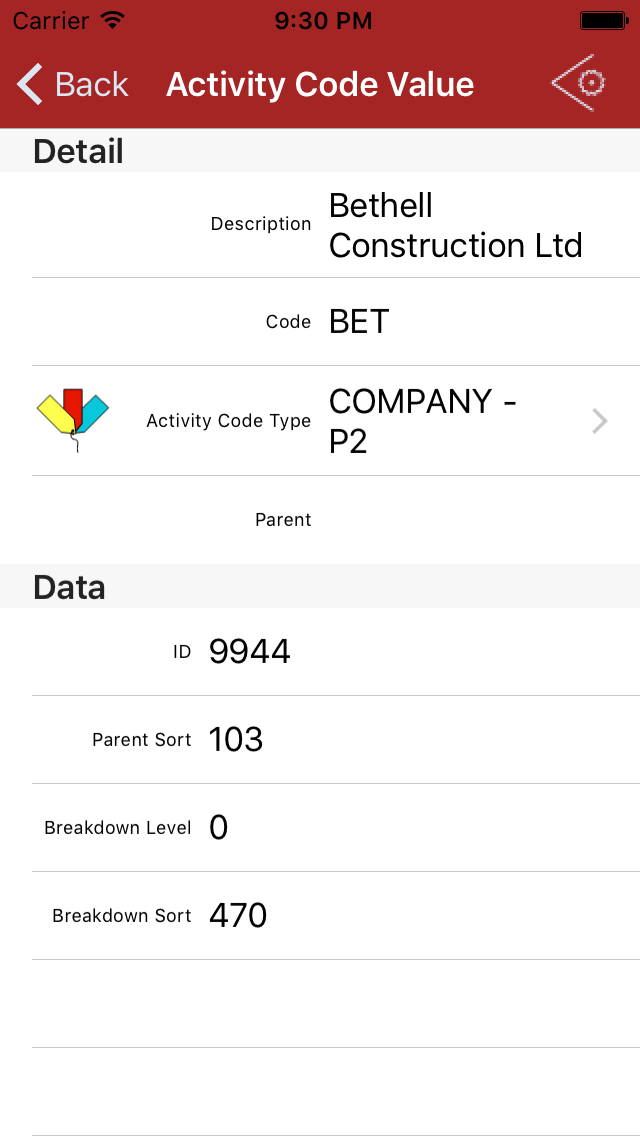 Tap an Activity Code Value item to present the detail view